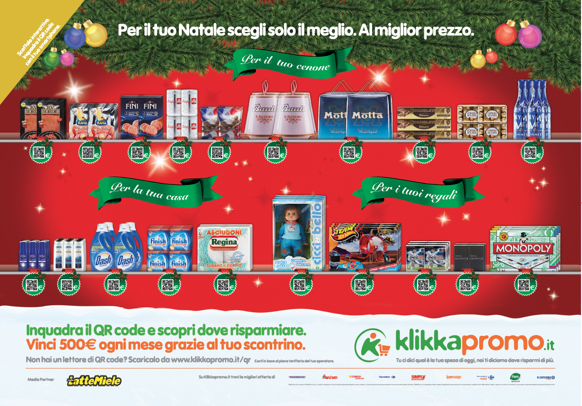 Per esempio, Klikkapromo ha aperto nella metropolitana milanese, lo scorso anno, uno spazio di ricerca di prodotti a prezzi convenienti sotto forma di poster pubblicitario che rappresenta uno scaffale virtuale. Scansionando con lo smartphone il QR code del prodotto desiderato, l’applicazione fornisce l’elenco dei supermercati in zona in cui si può trovare il prodotto, al prezzo più conveniente. L’app è disponibile per tutti i sistemi operativi e, oltre al servizio di identificazione e comparazione, consente agli utenti di creare la loro lista della spesa e scoprire in quali punti vendita recarsi per tagliare fino al 50% il costo della spesa selezionata. Un bell’aiuto.