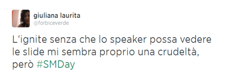 E invece il Mashable Social Media Day di Milano, organizzato dallo IED, è fatto proprio così. E la postazione degli speaker ci impediva di guardare le slide da monitor, avendo lo schermo alle spalle.