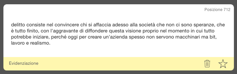 È che dopo tanto tempo leggo finalmente un libro che (nasce da e) serve a pensare, non a fare. Che crea uno scenario politico, non professionale. Che guarda fuori dalla finestra, non nello specchio. Grazie Mafe.